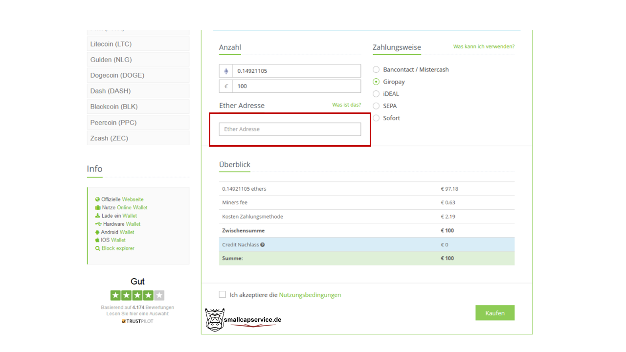 Falls man noch keine ETH besitzt, kommt nun Anycoin Direct zum Einsatz. Zuerst registriert man sich wieder. Die Benutzerführung erfolgt hier in deutscher Sprache. Nun kann man unter „Kaufen“ Ethereum auswählen und gelangt auf eine Eingabemaske, in der man den Betrag in EUR sowie die Adresse des ETH-Wallets eingeben kann, an das die Zahlung in ETH gesendet werden soll. Zur Zahlung kann dabei bequem auf bekannte Dienstleister, wie z.B. Sofort, zurückgegriffen werden oder man führt einfach eine SEPA-Zahlung durch. Erfahrungsgemäß ist die Nutzung von Sofort am bequemsten.